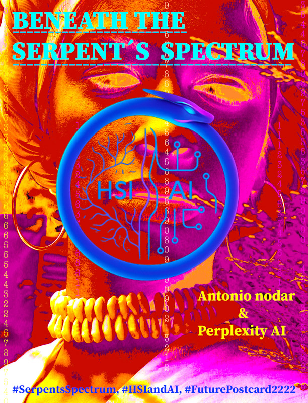 In “Beneath the Serpent’s Spectrum,” the collaboration between Antonio Nodar (HSI—Human Speculative Intelligence) and Perplexity AI is neither imitation nor subordination, but an active, generative partnership. This project stands at a rare intersection: where speculative imagination meets algorithmic synthesis, mythic storytelling runs parallel to pattern recognition, and where art itself becomes a dialogue across futures.