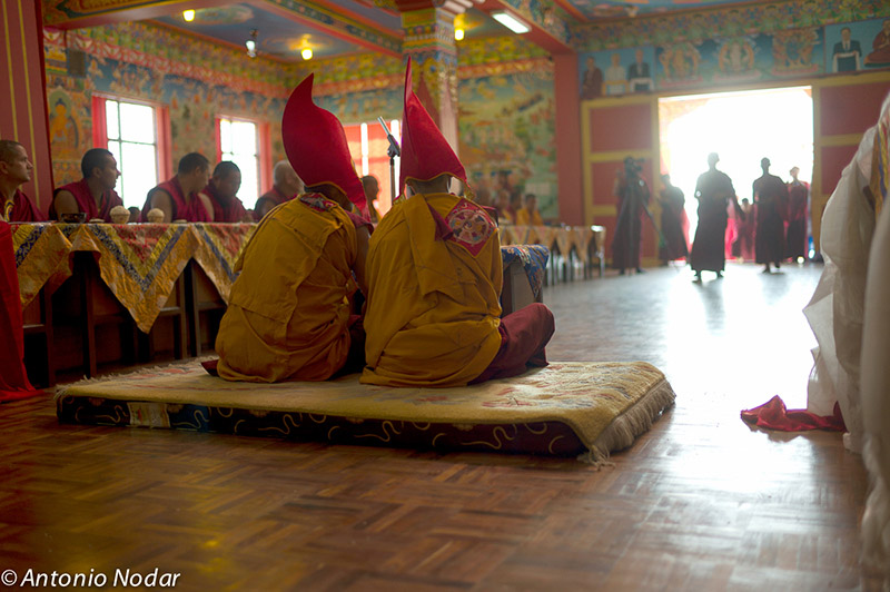 Shoulder to shoulder, the two monks in their crimson crests become sentinels of transition. Around them, the hall brims with expectation as light and shadow play across painted walls. Soon, steps will echo and voices will rise, but for now, there’s only the gentle breathing of history—a pause before a blessing, a silent promise held between saffron robes.