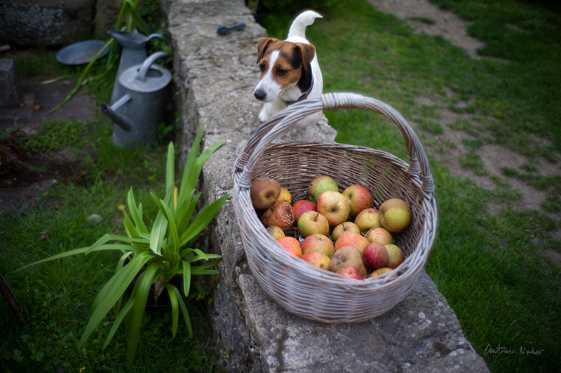 Sun slants across the basket—red and green apples, skin mottled by autumn.