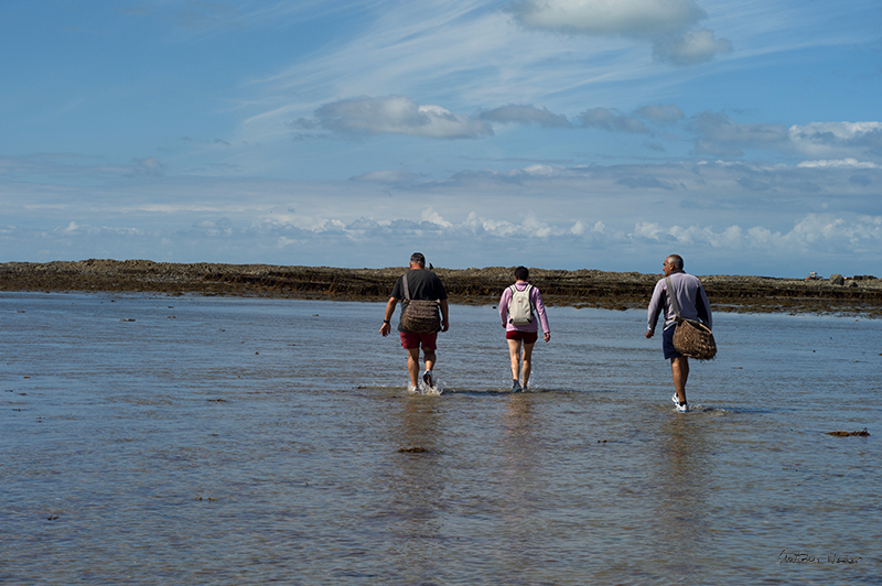 Seaweed-draped oyster beds are revealed by the receding tide, stretching across the sandy flats of Coutainville, Normandy.